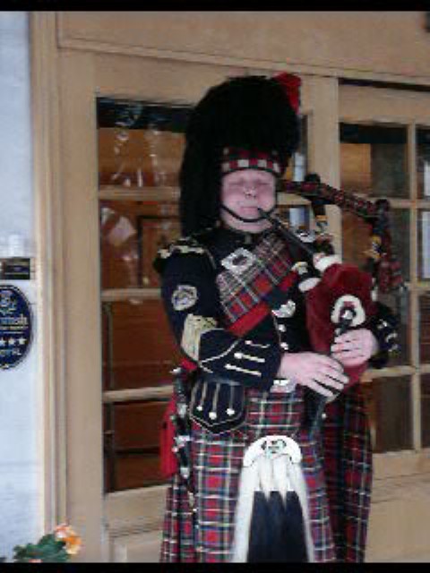 A bagpiper welcomed us to a Scottish Celidh, Edinburgh Scotland. With him are Marie & Janine. Taken by Mark.